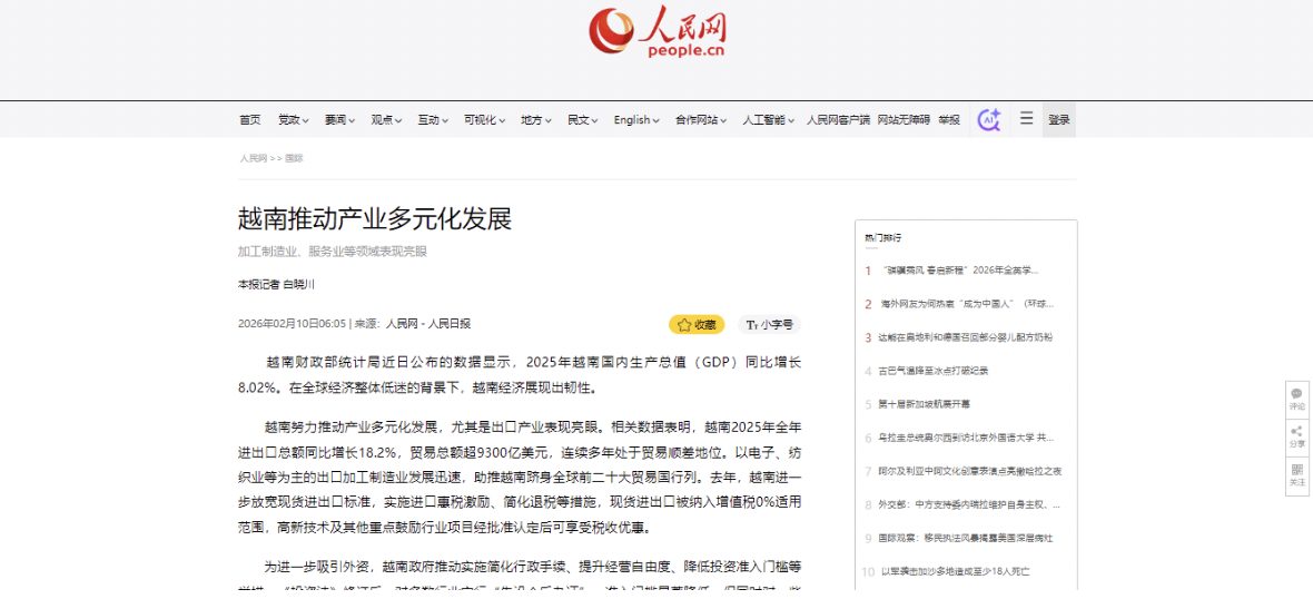 Theo đó, tờ Nhân dân Nhật báo, cơ quan ngôn luận chính thức của Đảng Cộng sản Trung Quốc đã đăng bài viết với tiêu đề “Việt Nam thúc đẩy phát triển đa dạng hóa ngành công nghiệp”, phân tích toàn diện về tình hình kinh tế Việt Nam. Bài báo dẫn số liệu mới nhất do Cục Thống kê thuộc Bộ Tài chính Việt Nam công bố, cho thấy năm 2025 tổng sản phẩm quốc nội GDP của Việt Nam tăng 8,02% so với năm trước. Theo đánh giá của Nhân dân Nhật báo, trong bối cảnh kinh tế toàn cầu nhìn chung trì trệ, mức tăng trưởng này cho thấy nền kinh tế Việt Nam đã thể hiện khả năng phục hồi mạnh mẽ, đồng thời phản ánh tính linh hoạt và hiệu quả của các chính sách kinh tế và tài khóa.