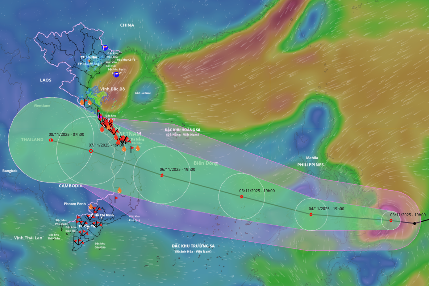 Trong khoảng ngày 5-6/11, khu vực giữa Biển Đông (bao gồm đặc khu Trường Sa), vùng biển ngoài khơi khu vực Đà Nẵng - Khánh Hòa có khả năng chịu tác động của gió mạnh cấp 12-14, giật trên cấp 17, sóng biển cao 8-10m. Biển động dữ dội. Toàn bộ tàu thuyền, các công trình hoạt động trong vùng nguy hiểm nói trên bị chịu tác động rất mạnh của dông, lốc, gió mạnh và sóng lớn.