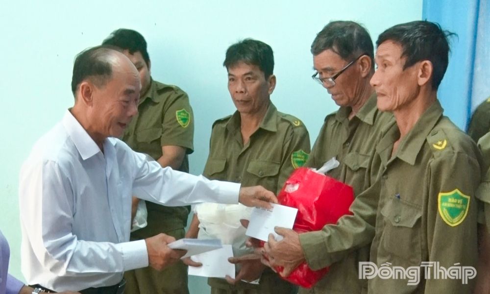Đại tá Trần Kim Thẩm, nguyên Phó Tổng biên tập Báo Công an nhân dân trao quà cho lực lượng An ninh cơ sở.