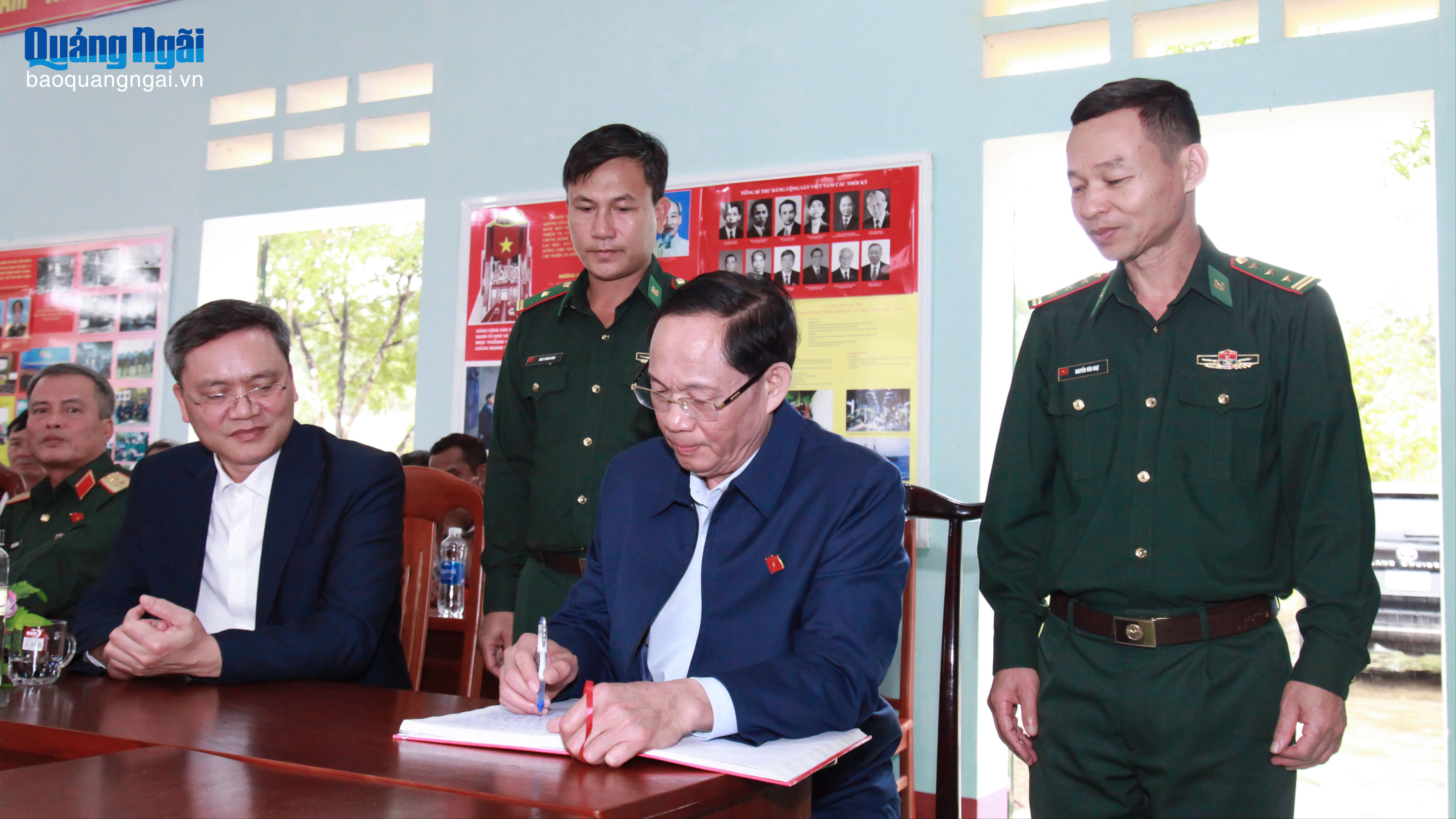 Phó Chủ tịch Quốc Hội Trần Quang Phương ghi lưu bút, kỷ niệm vào Sổ vàng truyền thống của Đồn Biên phòng Mô Rai.