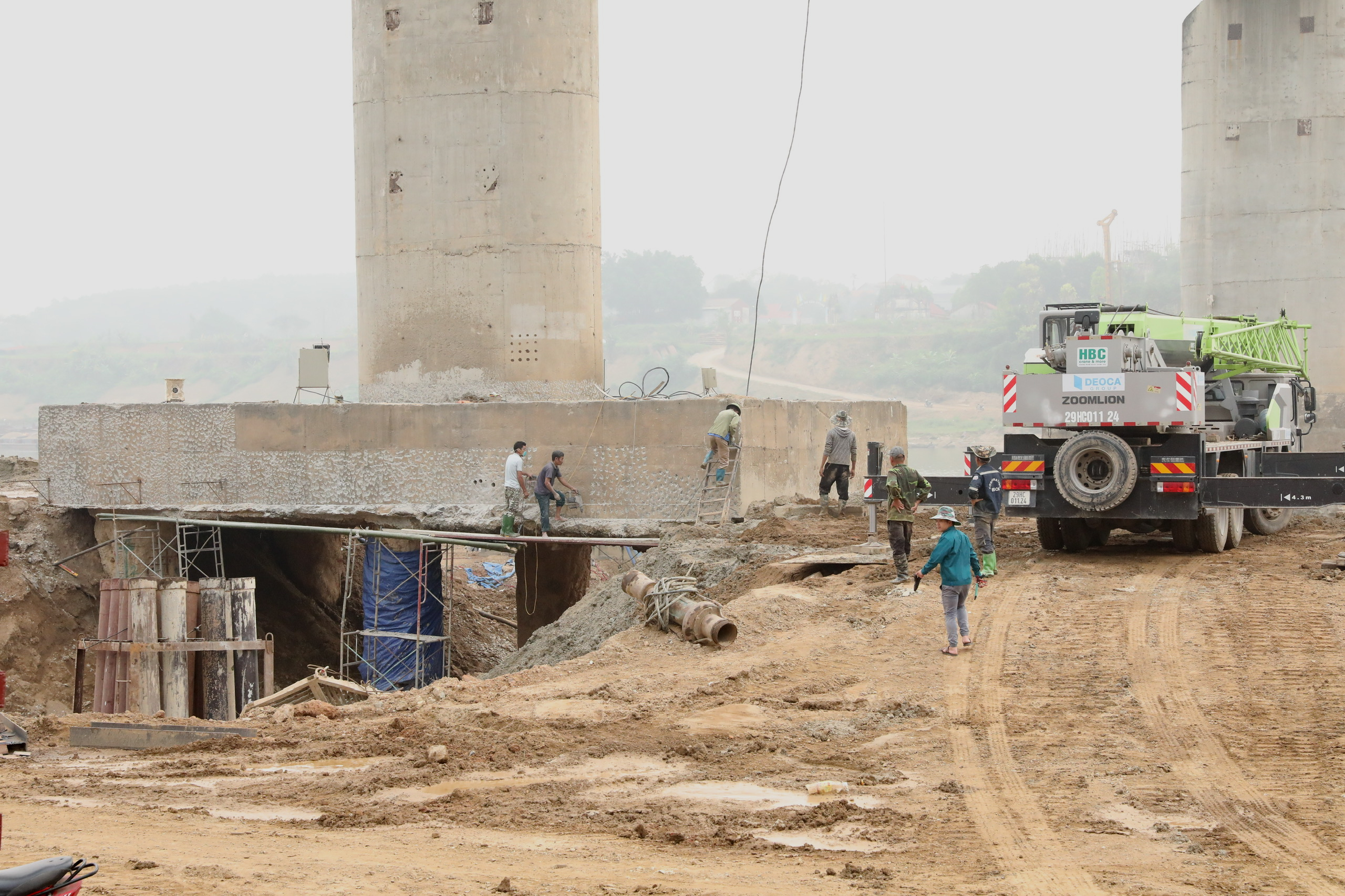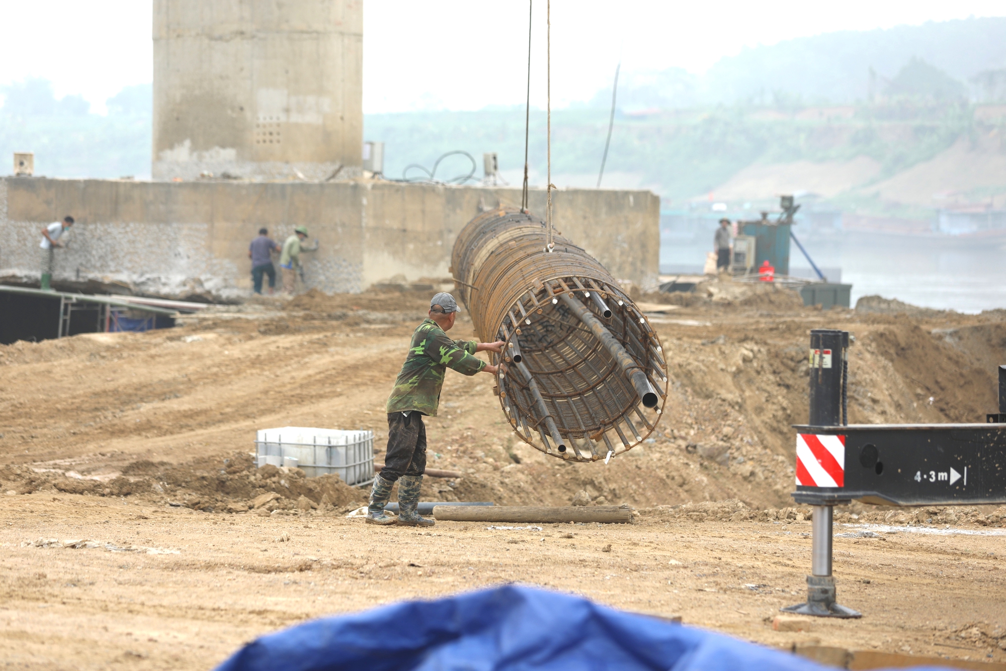 Ghi nhận của phóng viên Báo Xây dựng ngày 31/3, trên công trường đã huy động tổng số 60 cán bộ, công nhân trực tiếp triển khai phương án thi công; huy động 30 đầu thiết bị chủ lực (máy khoan cọc nhồi, máy xúc, máy ủi...) chia thành 2 mũi thi công 2 bên trụ T3 và T6.