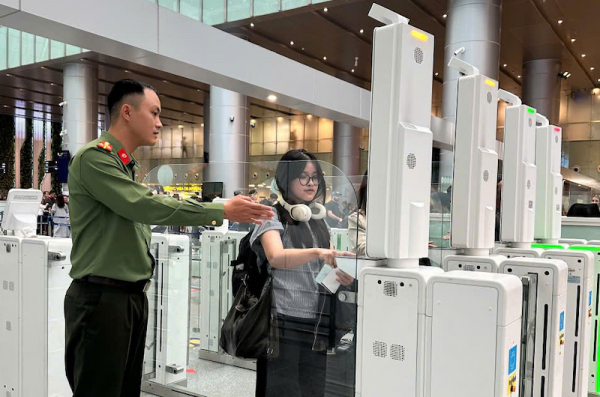 Cán bộ Công an cửa khẩu Cảng HKQT Đà Nẵng hướng dẫn người dân làm thủ tục qua cổng autogate.