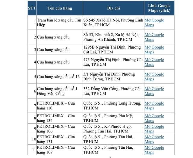 Danh sách một số điểm bán lẻ xăng dầu trên địa bàn TP. Hồ Chí Minh gần các tuyến kết nối/đường dẫn lên - xuống cao tốc TP. Hồ Chí Minh - Long Thành - Dầu Giây do Sở Công Thương TP. Hồ Chí Minh cung cấp.
