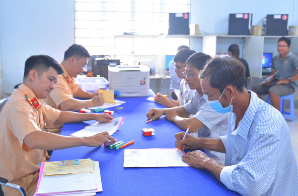 Cán bộ Phòng CSGT Công an tỉnh Cà Mau giải quyết nhanh chóng hồ sơ sát hạch giấy phép lái xe cho công dân.
