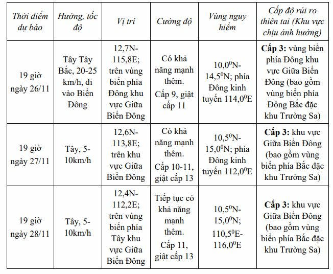 Trung tâm dự báo khí tượng thủy văn Quốc gia cảnh báo trong khoảng ngày 27-28/11, khu vực Giữa Biển Đông (bao gồm vùng biển phía Bắc đặc khu Trường Sa) có khả năng chịu tác động của gió mạnh cấp 10-11, giật cấp 14, sóng biển cao 7-9m, biển động dữ dội.