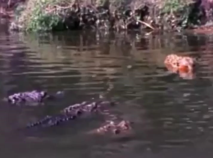 Tình hình càng trở nên tồi tệ khi mùi máu lan ra khắp mặt nước, thu hút thêm nhiều con cá sấu khác. Cả bầy nhanh chóng lao đến, bao vây và tấn công dồn dập. Dù cố gắng chống trả trong tuyệt vọng, báo đốm gần như không còn chút sức lực, chỉ biết gào thét yếu ớt trước khi bị những cú xoáy mạnh từ hàm cá sấu xé toạc thân thể.