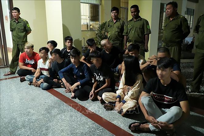 Nhóm đối tượng bị tạm giữ tại Công an phường Sóc Trăng. Ảnh: TTXVN phát