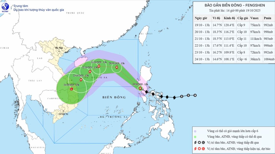 Theo đó, hồi 13 giờ ngày 19-10, vị trí tâm bão ở vào khoảng 14,7 độ Vĩ Bắc; 120,4 độ Kinh Đông, trên khu vực miền Trung Philippines. Sức gió mạnh nhất vùng gần tâm bão mạnh cấp 9 (75-88 km/giờ), giật cấp 11. Di chuyển theo hướng Tây Bắc với tốc độ 20-25 km/giờ.