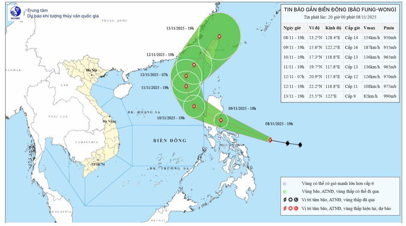 Bản đồ dự báo quỹ đạo và cường độ bão Fung-Wong phát lúc 20 giờ tối 8/11/2025. (Nguồn: Trung tâm Dự báo khí tượng thủy văn quốc gia)