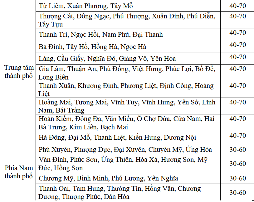 Bảng dự báo lượng mưa chi tiết tới cấp xã của Hà Nội.