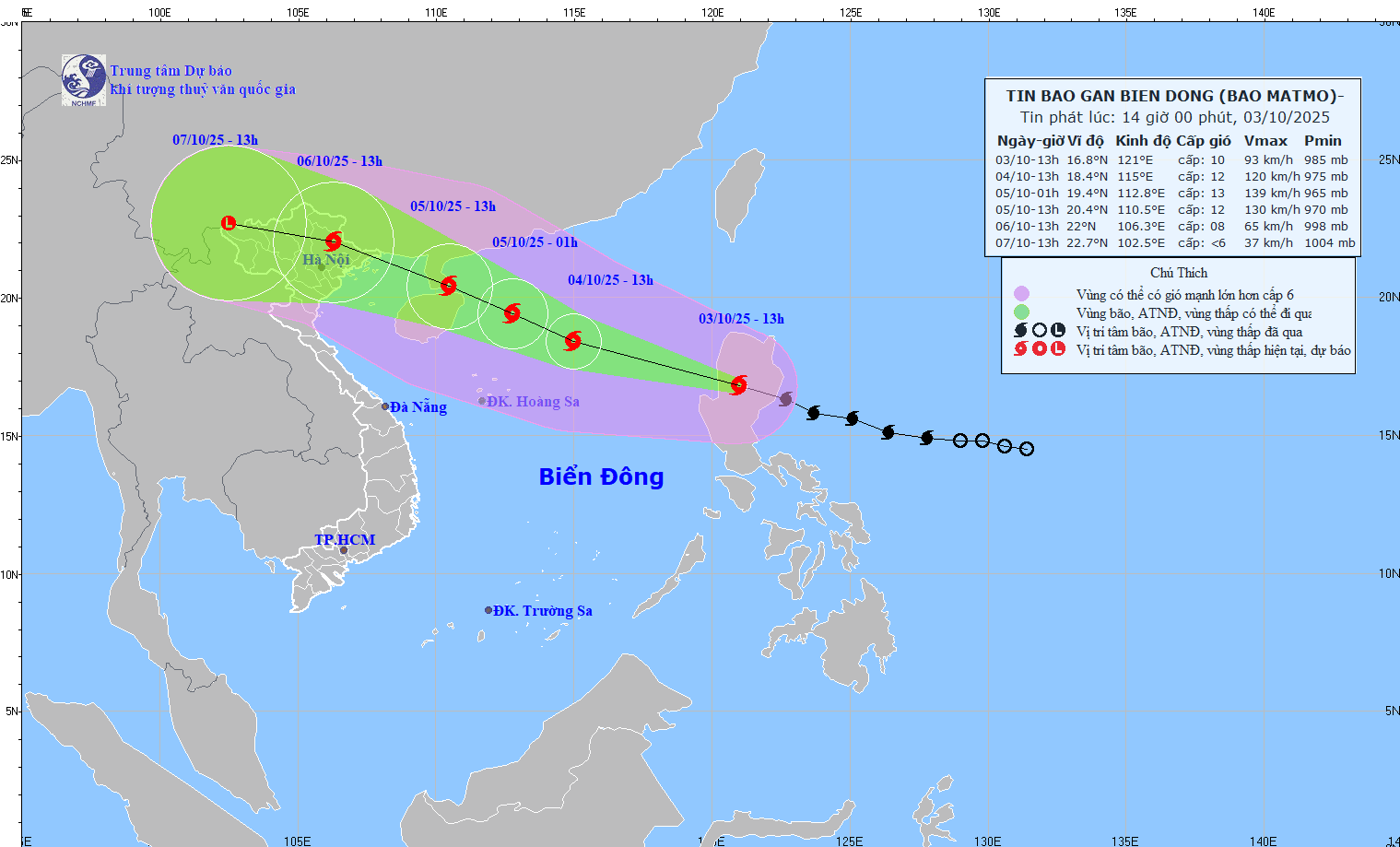 Đến 13 giờ ngày 04/10: Bão đi vào Biển Đông, khả năng mạnh thêm. Tâm bão ở khoảng 18,4 độ Vĩ Bắc; 115,0 độ Kinh Đông, cách bán đảo Lôi Châu (Trung Quốc) khoảng 480 km về phía Đông Đông Nam. Gió mạnh cấp 11-12, giật cấp 15. Vùng nguy hiểm từ vĩ tuyến 16,0 đến 21,0 độ Bắc và phía Đông kinh tuyến 113,0 độ Đông. Cấp độ rủi ro thiên tai: cấp 3.