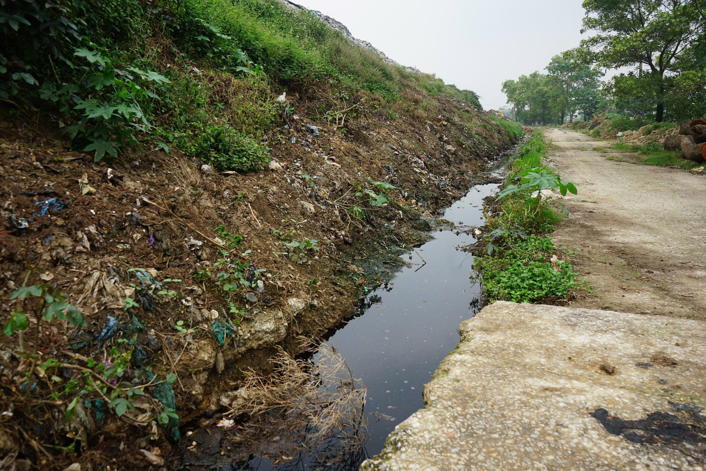 Theo ghi nhận, bãi rác đang trong tình trạng quá tải nghiêm trọng, tạo thành núi rác khổng lồ. Dù đứng cách xa hàng trăm mét, mùi hôi nồng nặc vẫn bốc lên. Đặc biệt, tại các bể lắng quanh khu vực bãi rác, nước đen kịt và có dấu hiệu rò rỉ ra bên ngoài.
