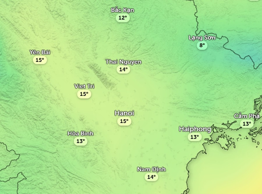 Dự báo nhiệt độ cảm nhận ở một số khu vực tại miền Bắc vào trưa và chiều mai, 19/11: Trời lạnh khô. Ảnh: Zoom Earth, OpenStreetMap, ICON.