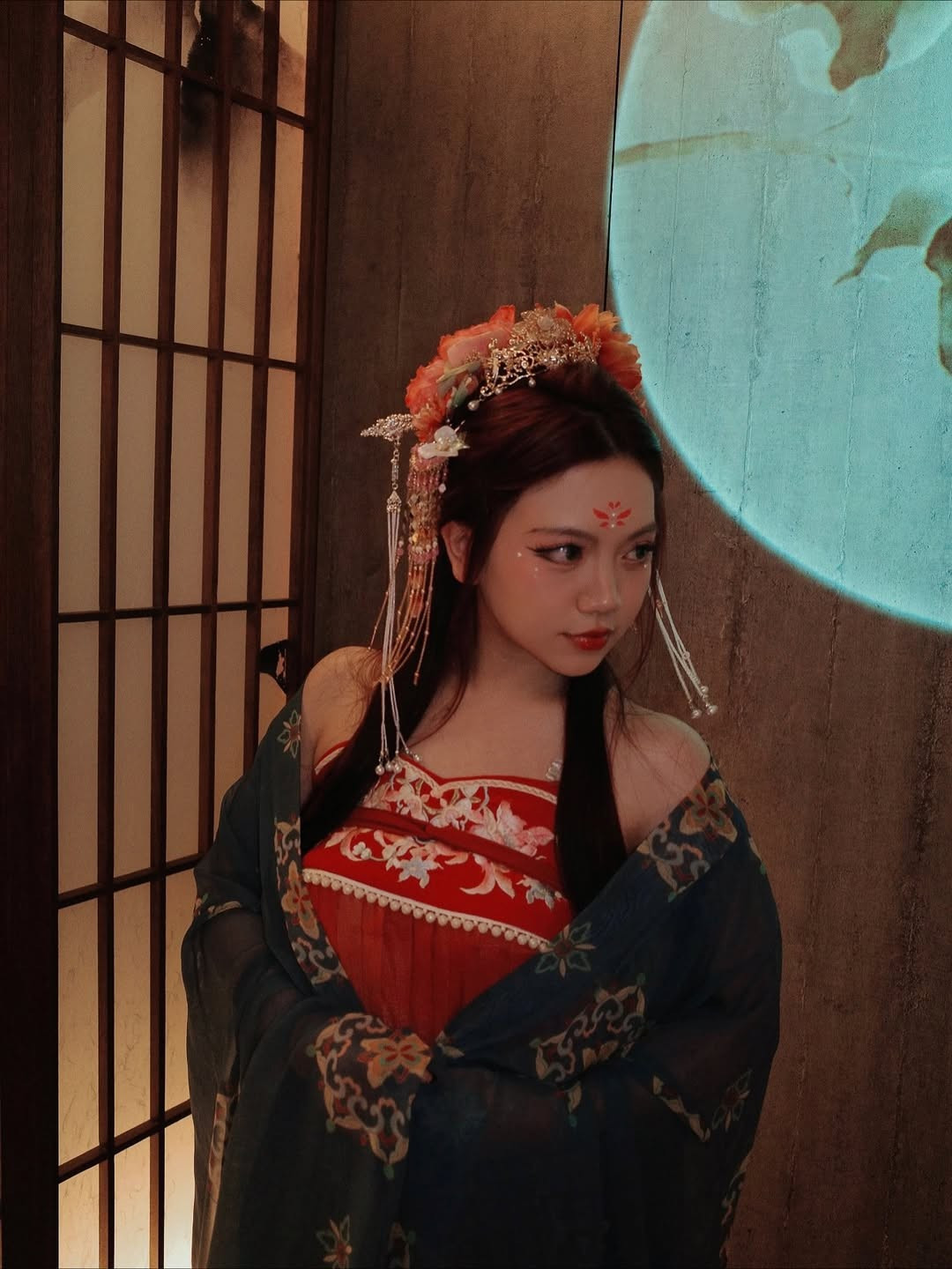 Chiếc áo yếm màu đỏ thêu hoa tinh tế kết hợp cùng lớp áo choàng mỏng màu xanh có họa tiết hoa văn đậm chất Á Đông đã tạo nên một tổng thể vừa duyên dáng vừa kiêu sa. (Ảnh: IGNV)