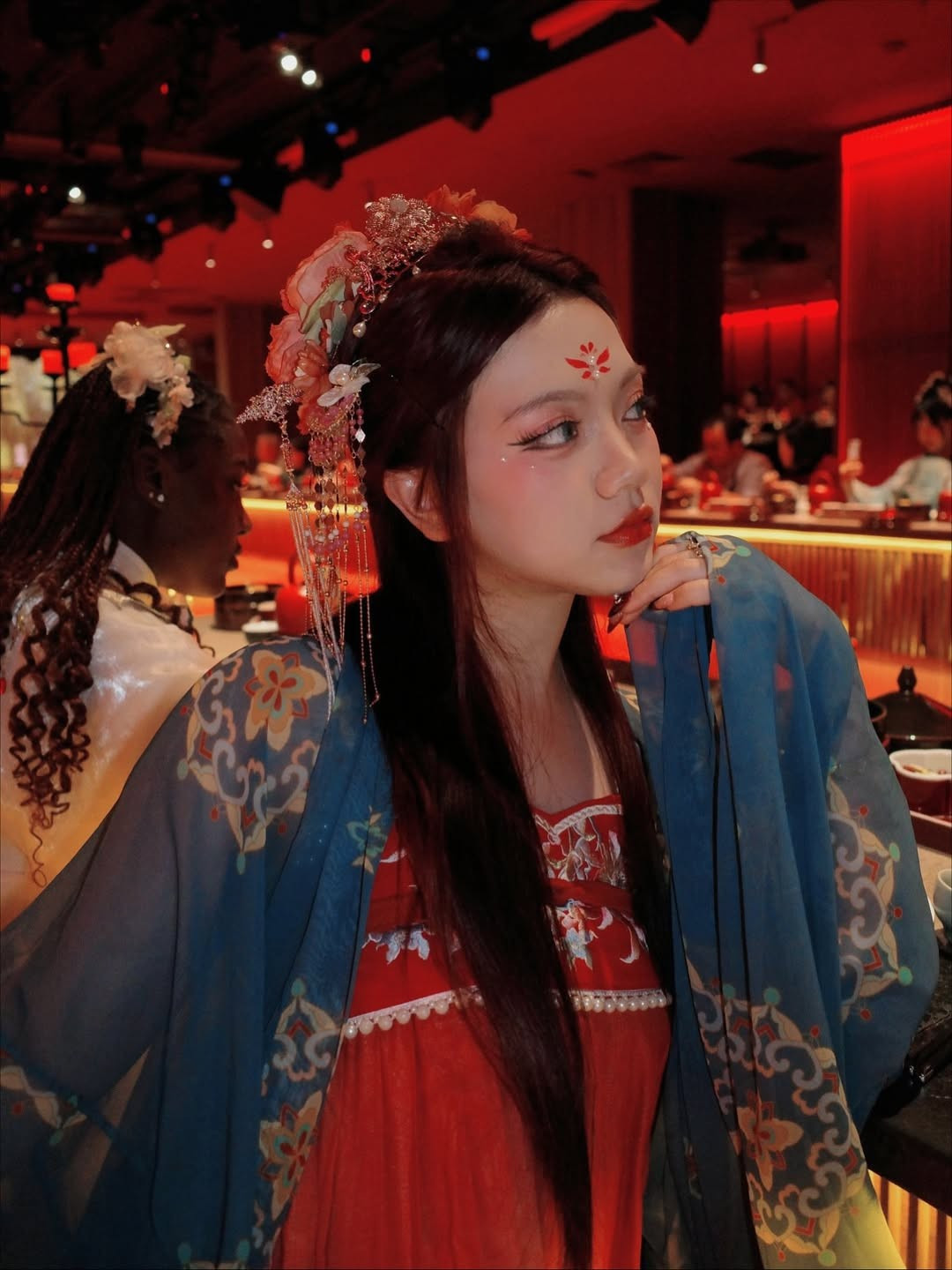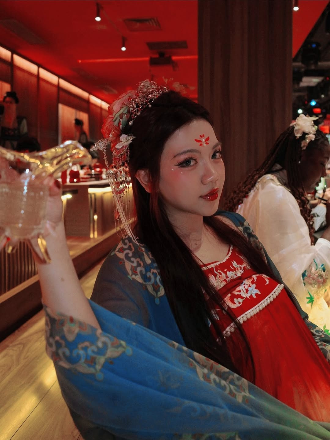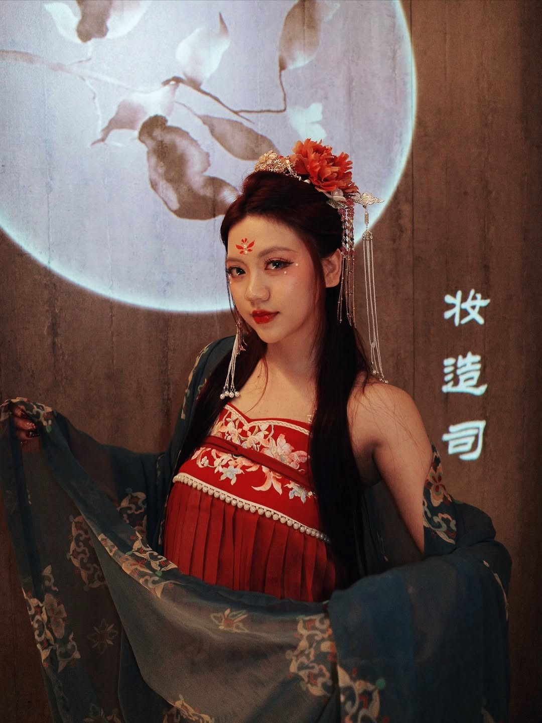 Trong loạt ảnh mới, Bảo Hân Helia xuất hiện trong bộ trang phục mang phong cách cổ trang Trung Quốc, nổi bật với tông màu đỏ rực rỡ và xanh ngọc quý phái. (Ảnh: IGNV)