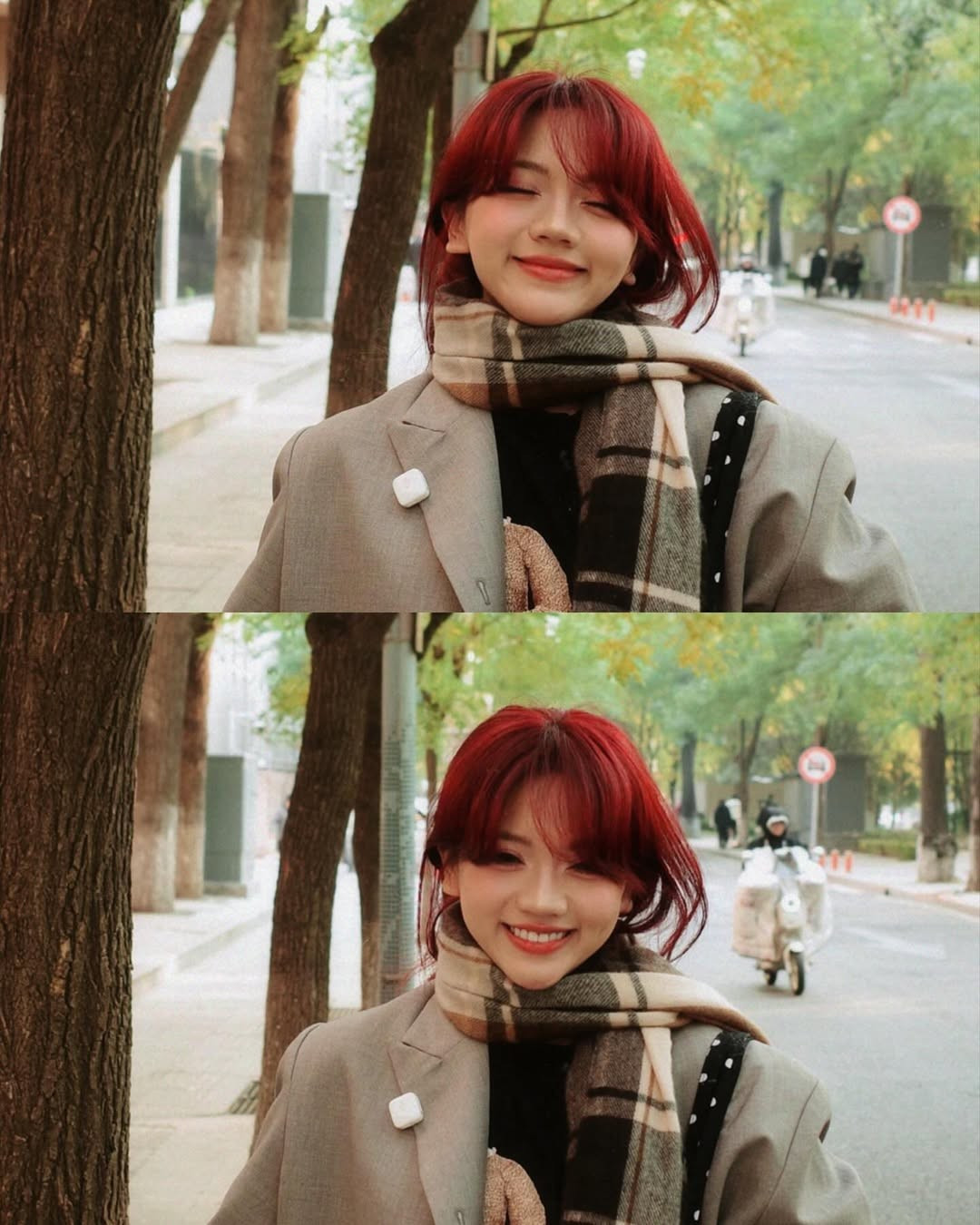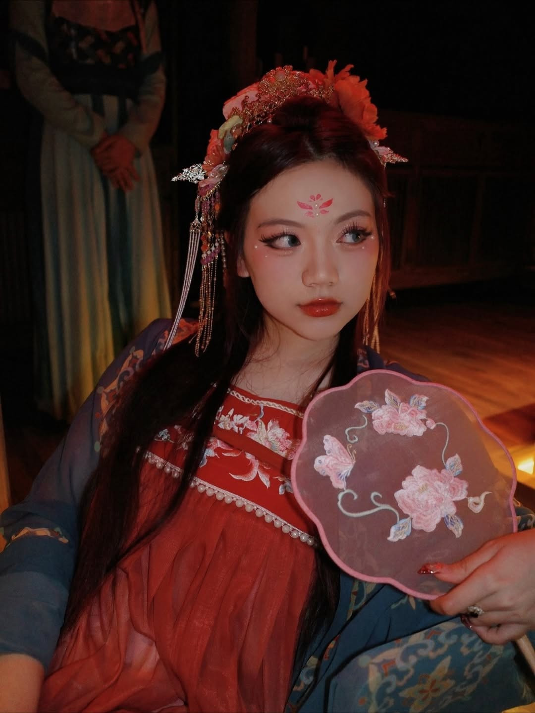 Bảo Hân lựa chọn lối make-up nữ tính nhưng không kém phần sắc sảo. Điểm nhấn là bông hoa điểm trang trên trán màu đỏ rực hình cánh hoa, đôi mắt được kẻ vẽ kỹ lưỡng tạo chiều sâu và đôi môi đỏ cam quyến rũ, tất cả đều theo phong cách trang điểm cổ trang.(Ảnh: IGNV)