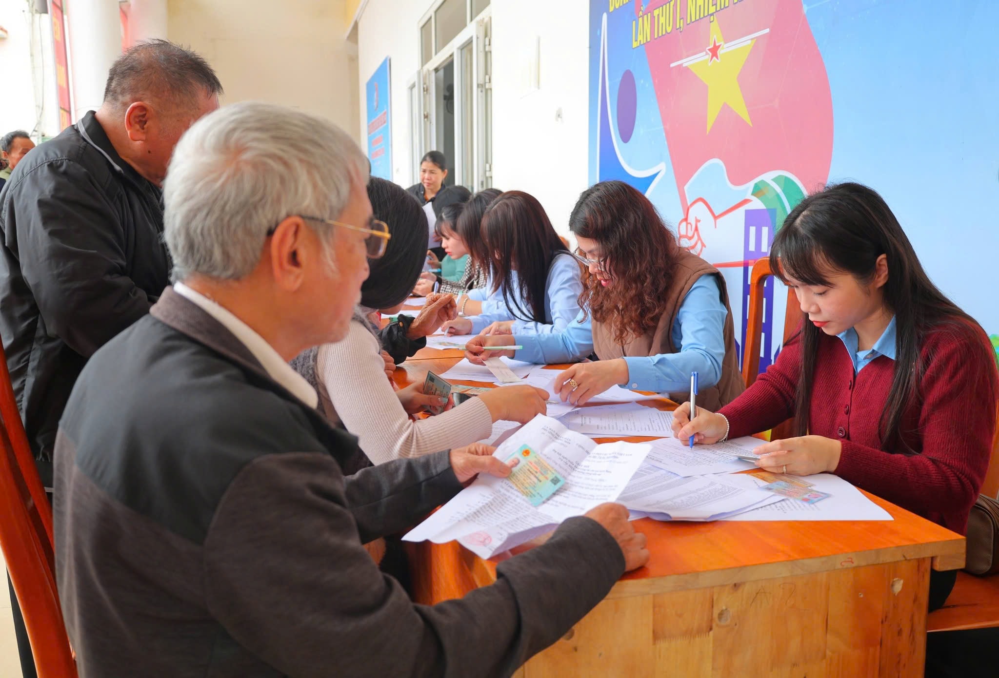 Cán bộ BHXH tỉnh Quảng Trị hướng dẫn người dân đăng ký nhận lương hưu, trợ cấp BHXH qua tài khoản cá nhân. Ảnh: Huy Hương