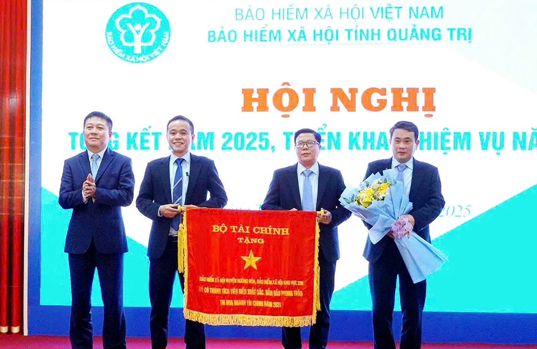 Trao cờ thi đua của Bộ Tài chính cho BHXH huyện Hướng Hóa (nay là BHXH cơ sở Khe Sanh) vì thành tích xuất sắc năm 2024 - Ảnh: Phan Khiêm