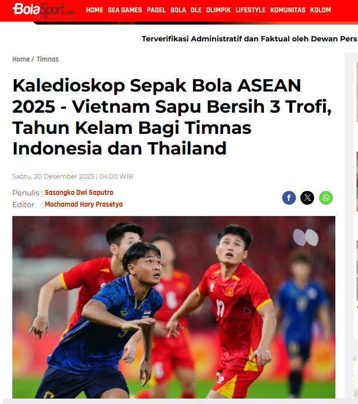 Năm 2025 đã đánh dấu một cột mốc chói lọi cho bóng đá Việt Nam khi thiết lập sự thống trị toàn diện tại khu vực Đông Nam Á. Theo phân tích từ tờ Bola Sport của Indonesia, đây chính là "năm của Việt Nam" với những chiến tích mang tính hủy diệt, khiến hai đối thủ lớn nhất là Indonesia và Thái Lan rơi vào trạng thái thất vọng kéo dài.