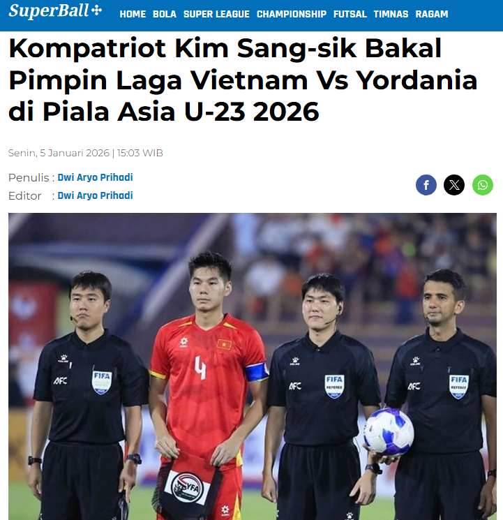 Trước thềm trận ra quân của U23 Việt Nam tại Vòng chung kết (VCK) U23 châu Á 2026, công tác trọng tài bất ngờ trở thành chủ đề tâm điểm của truyền thông khu vực. Đặc biệt, báo chí Indonesia đang dành sự quan tâm đặc biệt đến việc Liên đoàn Bóng đá Châu Á (AFC) chỉ định tổ trọng tài người Hàn Quốc điều hành trận đấu mở màn bảng A.