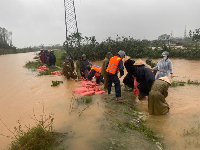 Công an xã Kỳ Anh (Hà Tĩnh) đắp đất, gia cố bờ mương, không để dòng nước tiếp tục tràn vào khu vực dân cư