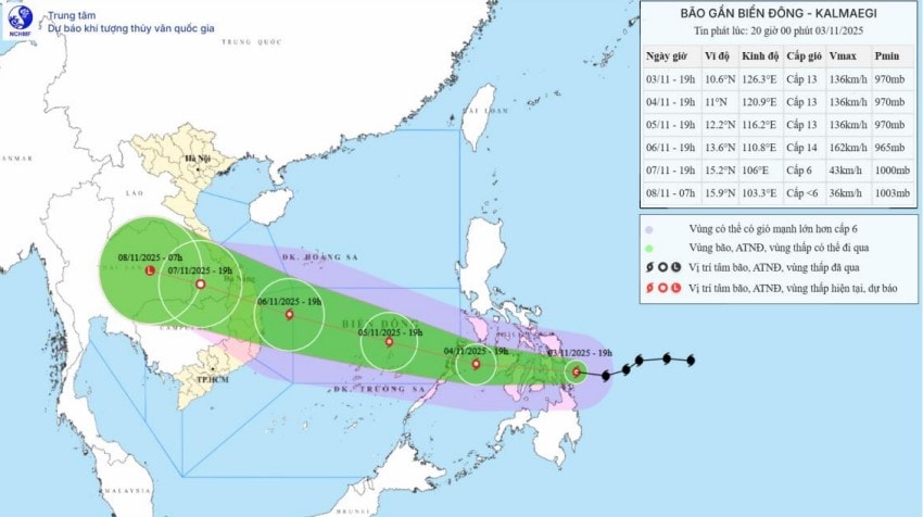 Lưu ý, trong khoảng ngày 05-06/11, khu vực Giữa Biển Đông (bao gồm đặc khu Trường Sa), vùng biển ngoài khơi khu vực Đà Nẵng - Khánh Hòa có khả năng chịu tác động của gió mạnh cấp 12-14, giật trên cấp 17, sóng biển cao 8,0-10,0m. Biển động dữ dội.
