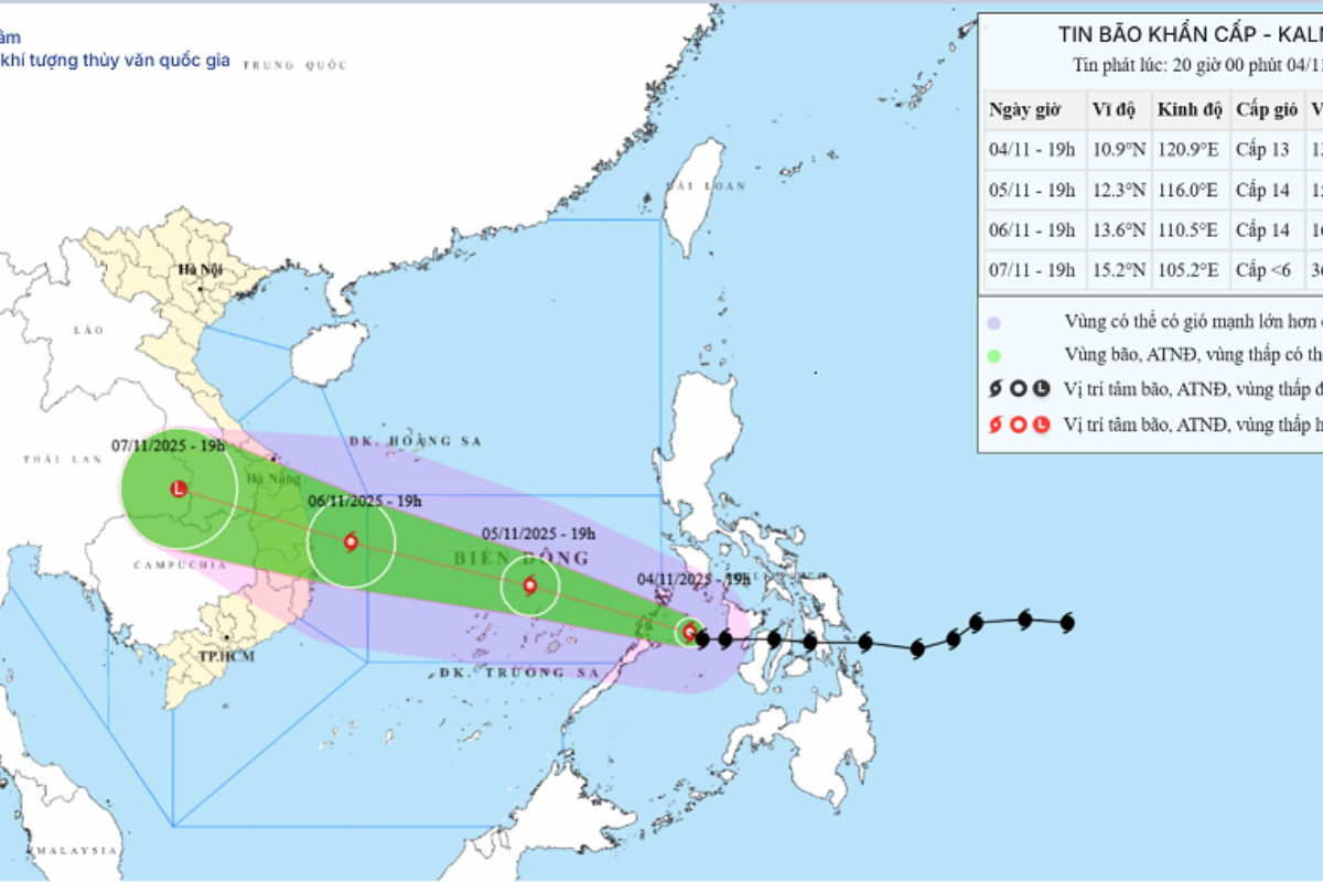 Theo Trung tâm Dự báo khí tượng thủy văn quốc gia, hồi 16h ngày 4/11, tâm bão ở khoảng 10,7°N; 121,3°E, trên vùng biển phía Tây miền Trung Philippines, cách đảo Song Tử Tây khoảng 770km về phía Đông. Sức gió mạnh nhất vùng gần tâm bão cấp 13 (134–149km/giờ), giật cấp 16.