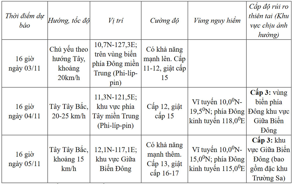 Trong khoảng 5-6/11, khu vực giữa Biển Đông (bao gồm đặc khu Trường Sa), vùng biển ngoài khơi khu vực Đà Nẵng - Khánh Hòa có khả năng chịu tác động của gió mạnh cấp 12-14, giật trên cấp 17, sóng biển cao 8-10m. Biển động dữ dội.