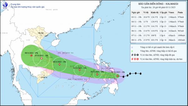 Tối 3/11, Trung tâm Dự báo Khí tượng Thủy văn quốc gia cho biết, lúc 19h hôm nay, tâm bão Kalmaegi trên vùng ven biển phía đông miền Trung Philippines, sức gió mạnh nhất 149 km/h, cấp 12-13, giật cấp 16 và đang theo hướng tây với tốc độ khoảng 25 km/h. Như vậy, so với sáng nay, bão đã tăng gần hai cấp và tăng gần 5 cấp kể từ khi mạnh lên thành bão sáng qua.