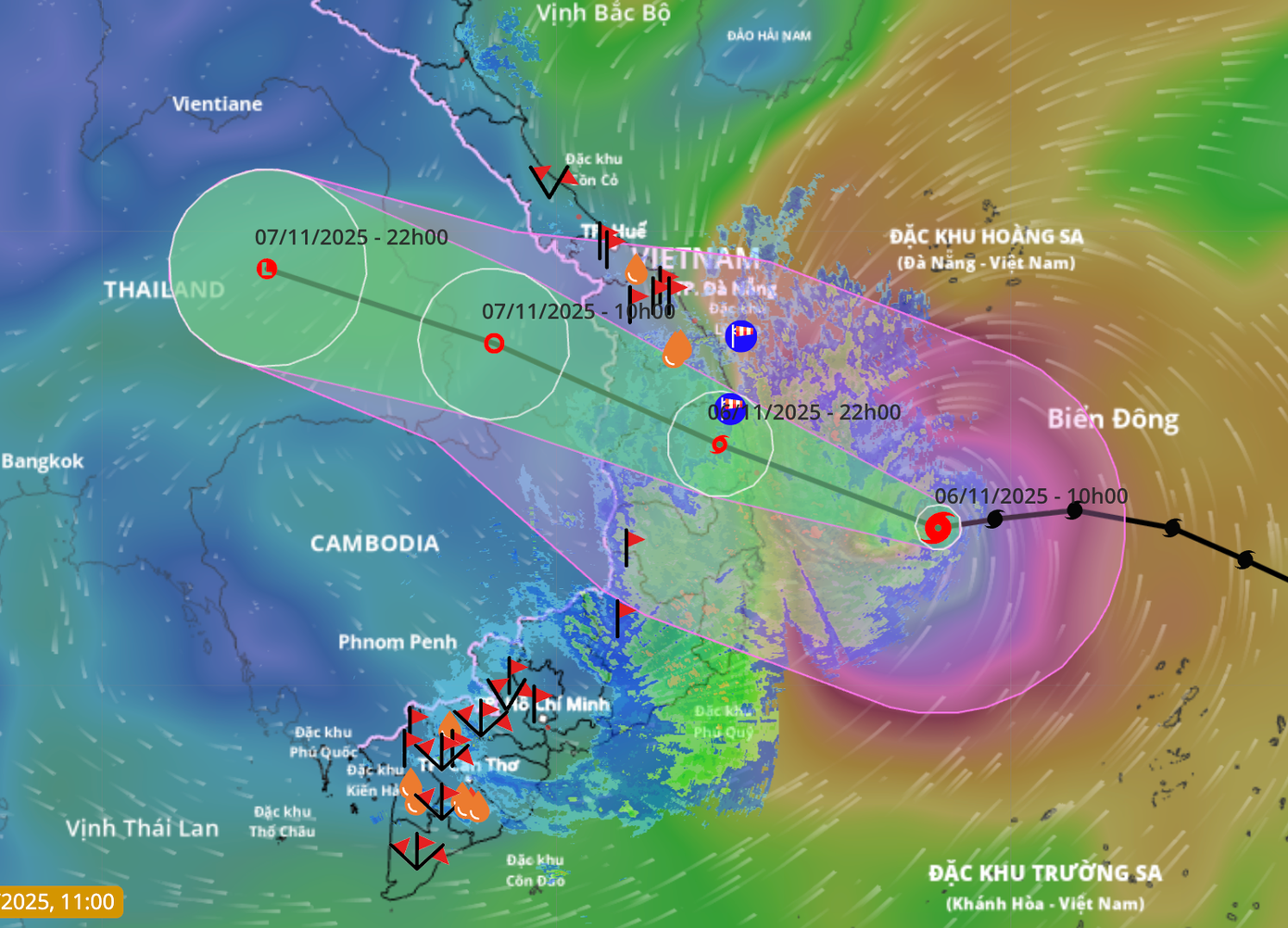 Trong đêm nay, bão sẽ càn quét qua khu vực Nam Trung Bộ nước ta, đi sang khu vực Nam Lào. Đến 10h sáng mai, bão đi sâu vào đất liền khu vực Nam Lào và suy yếu thành một áp thấp nhiệt đới với cường độ cấp 7, giật cấp 9. Do cường độ rất mạnh, đến tối ngày 7/11, khi đi sang phía đông của Thái Lan bão mới suy yếu thành vùng áp thấp và tan dần.