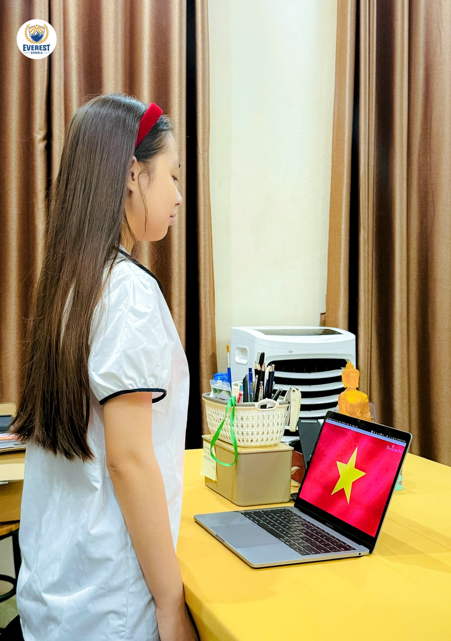 Dù không trên sân trường, nhưng trong tim mỗi học sinh vẫn rộn ràng âm vang Quốc ca, Đội ca, vẫn là khoảnh khắc cùng nhau hướng về Tổ quốc qua màn hình. - Ảnh: Hệ thống Giáo dục Everest
