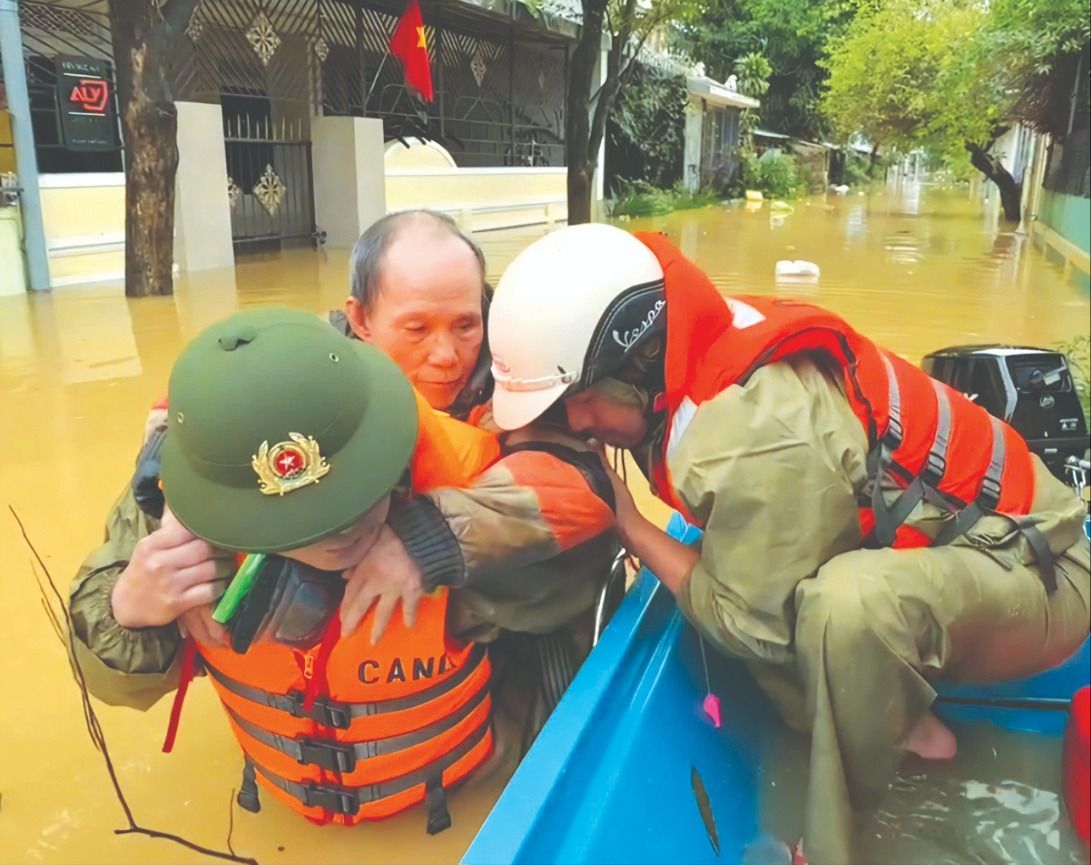 Công an di dời khẩn cấp người dân vùng thấp trũng phường Phú Xuân, TP Huế đi tránh lũ. Ảnh: VĂN THẮNG