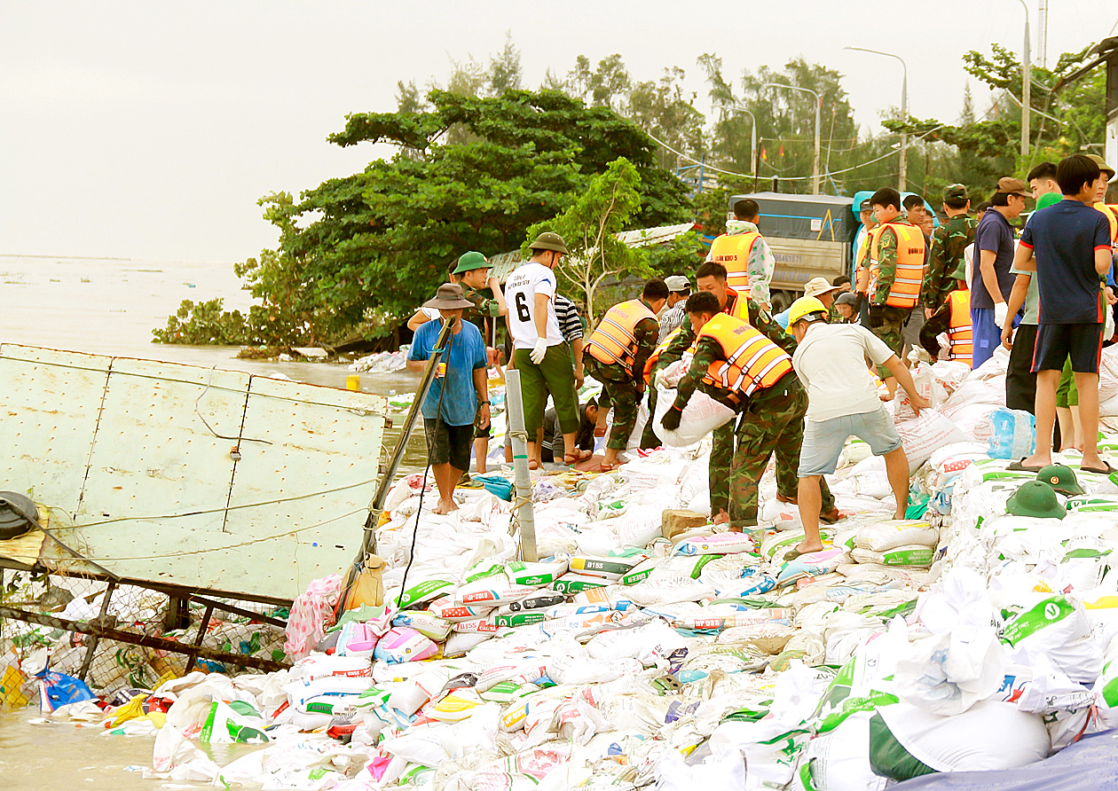 Trong khi đó, ở xã Duy Nghĩa (TP Đà Nẵng), hơn 1.000 người dân cùng hàng trăm cán bộ, chiến sĩ Quân khu 5 vẫn túc trực ngày đêm gia cố bờ kè An Lương bị sạt lở nặng sau bão số 12. Điểm sạt dài gần 1km, đe dọa hơn 300 hộ dân ven biển. Sau gần một tuần khẩn trương, công tác khắc phục đã cơ bản hoàn tất, chưa ghi nhận sạt lở mới.