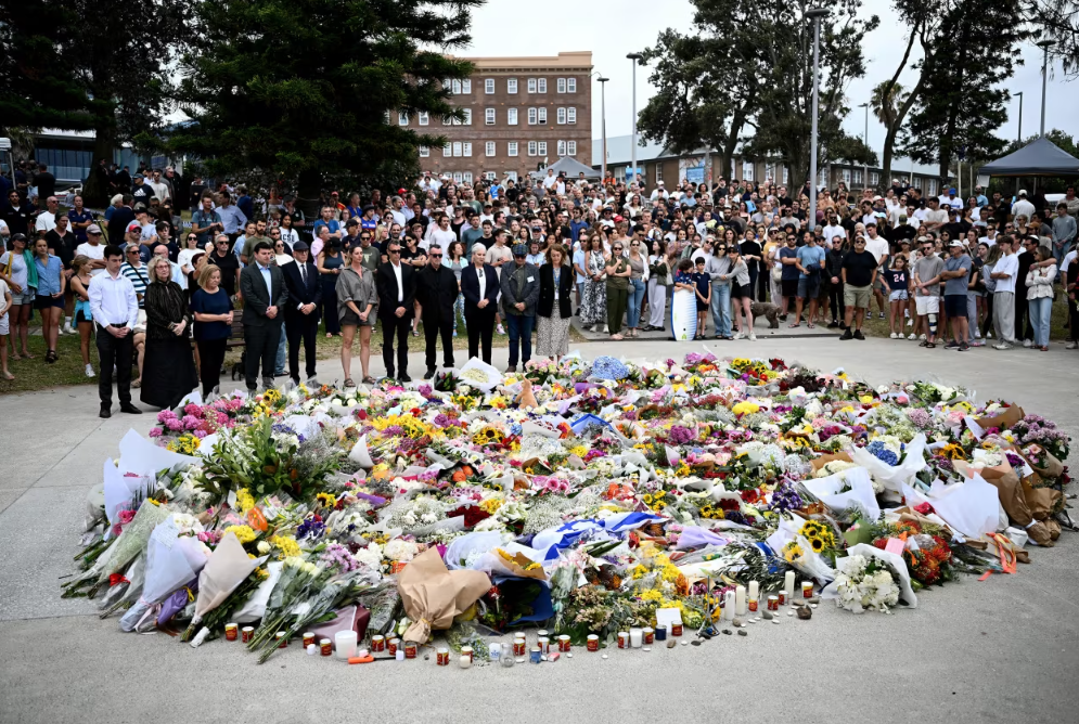 Người dân đặt hoa tưởng niệm các nạn nhân thiệt mạng trong vụ xả súng tại bãi biển Bondi ở Sydney. Ảnh: AAP