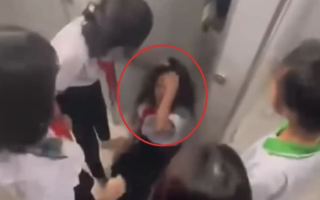 Nữ sinh lớp 8, Trường THCS An Điền, TPHCM, bị đánh đập trong khu vực nhà vệ sinh của trường. Ảnh cắt từ clip