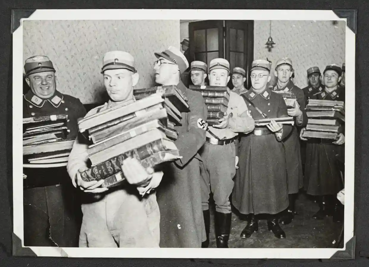 Một tấm ảnh cho thấy những người đàn ông và phụ nữ Đức trung niên thản nhiên mỉm cười khi một sĩ quan Đức Quốc xã đập vỡ cửa sổ một cửa hàng. Trong một bức ảnh khác, một đội quân cầm trên tay một chồng sách Do Thái, có lẽ để đem đi đốt. Một hình ảnh khác cho thấy một sĩ quan Đức Quốc xã đổ xăng trong một giáo đường Do Thái trước khi châm lửa.