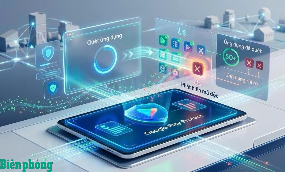 Giao diện tính năng Google Play Protect giúp quét và phát hiện các ứng dụng chứa mã độc trên hệ điều hành Android. Đồ họa: Thái Bình