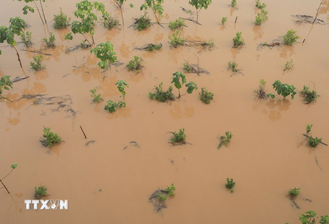 Nước ngập nhấn chìm hoa màu tại bãi giữa sông Hồng. (Ảnh: Phan Phương/TTXVN)