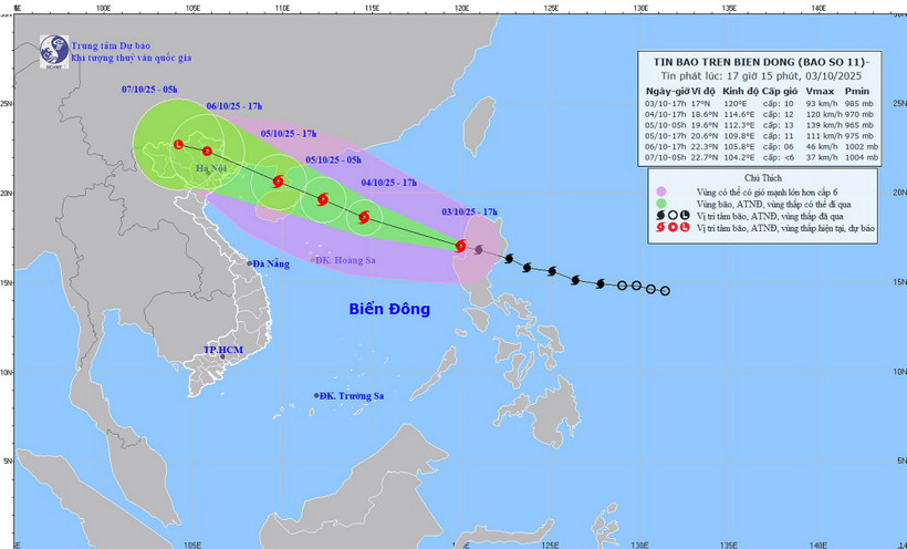Hồi 17 giờ, vị trí tâm bão ở vào khoảng 17,0 độ Vĩ Bắc; 120,0 độ Kinh Đông, trên vùng biển phía Đông khu vực Bắc Biển Đông. Sức gió mạnh nhất vùng gần tâm bão mạnh cấp 10 (89-102km/giờ), giật cấp 13. Di chuyển theo hướng Tây Tây Bắc, tốc độ khoảng 25km/h.