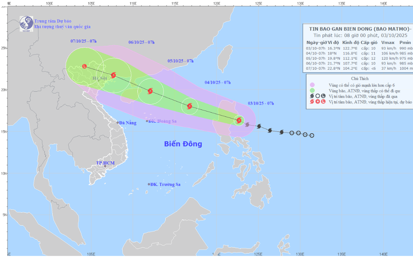 Theo Trung tâm Dự báo Khí tượng Thủy văn quốc gia, hồi 7h ngày 3/10, tâm bão Matmo ở 16,3 độ Vĩ Bắc; 122,7 độ Kinh Đông, cách đảo Lu-Dông khoảng 150 km về phía Đông. Sức gió mạnh nhất vùng gần tâm bão đạt cấp 9-10 (75-102 km/h), giật cấp 13, di chuyển theo hướng Tây Tây Bắc với tốc độ khoảng 25 km/h.