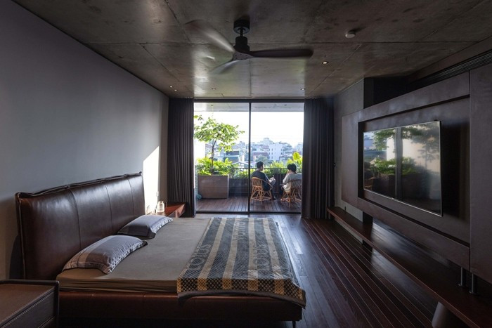 Phòng ngủ chính ở tầng 5 tận dụng cả mặt tiền và khoảng không trung tâm, tạo nên một không gian nghỉ ngơi yên tĩnh, thoải mái cho chủ nhà. Ảnh: Triệu Chiến