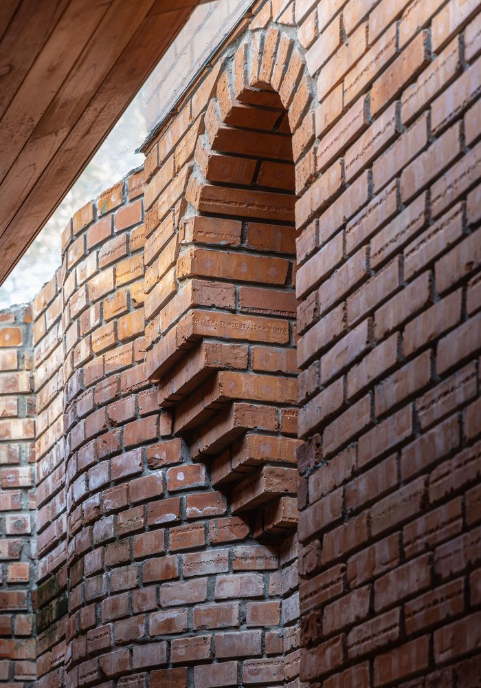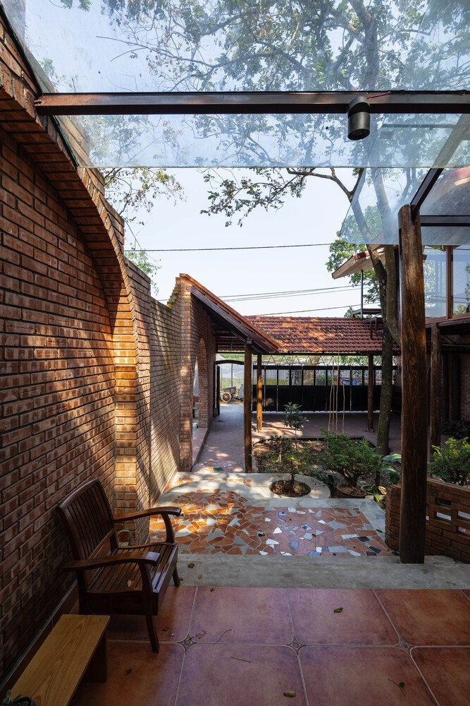 Ngôi nhà gồm 1 tầng và một phòng ngủ ở gác lửng. Toàn bộ không gian xây bằng gạch mộc, tạo nên sự trầm mặc, mang nét hoài cổ. Ảnh: Trieu Chien