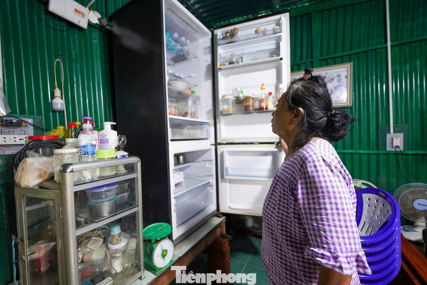 Bà Kiêu Thị Ngọc loay hoay với chiếc tủ lạnh ướt sũng, phơi nắng từ sớm nhưng bật lên vẫn không hoạt động. Bên cạnh là bếp gas, nồi niêu, chén đĩa đặt trong đống bùn đặc sệt. “Ngập cả mấy ngày đêm, nước ăn vô hết rồi. Cái nào không vỡ thì cũng hư mạch điện. Xót của nhưng biết sao được,” bà Ngọc ngậm ngùi.