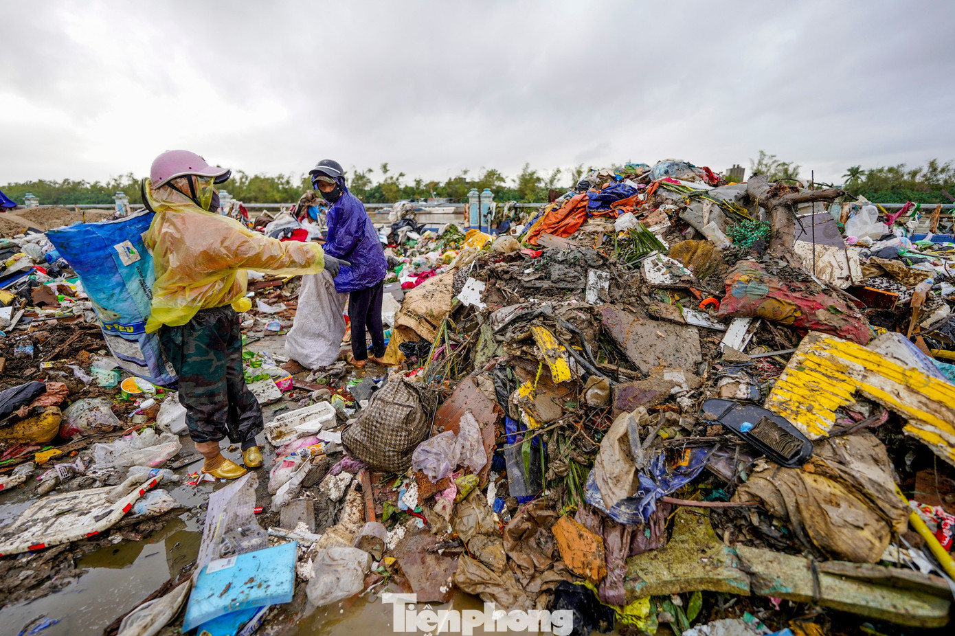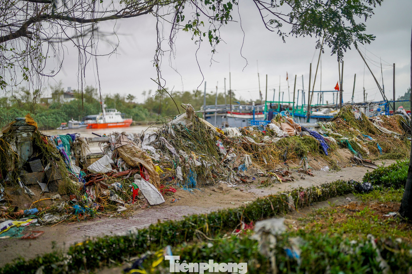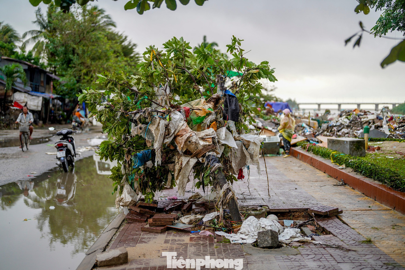 Rác phủ kín ngọn cây bên đường.