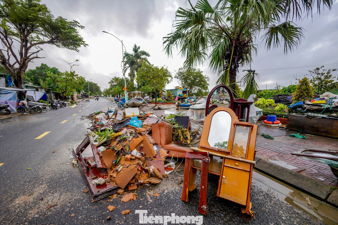Sáng 23/11, nước vừa rút được hai ngày, dọc bờ kè Bạch Đằng (phường Tuy Hòa) la liệt đồ đạc người dân bày ra trước cửa, dính đầy bùn: bàn ghế, tủ lạnh, quạt, lồng chim, quần áo… cái nào cũng cong vênh, hư hỏng như đống phế liệu.