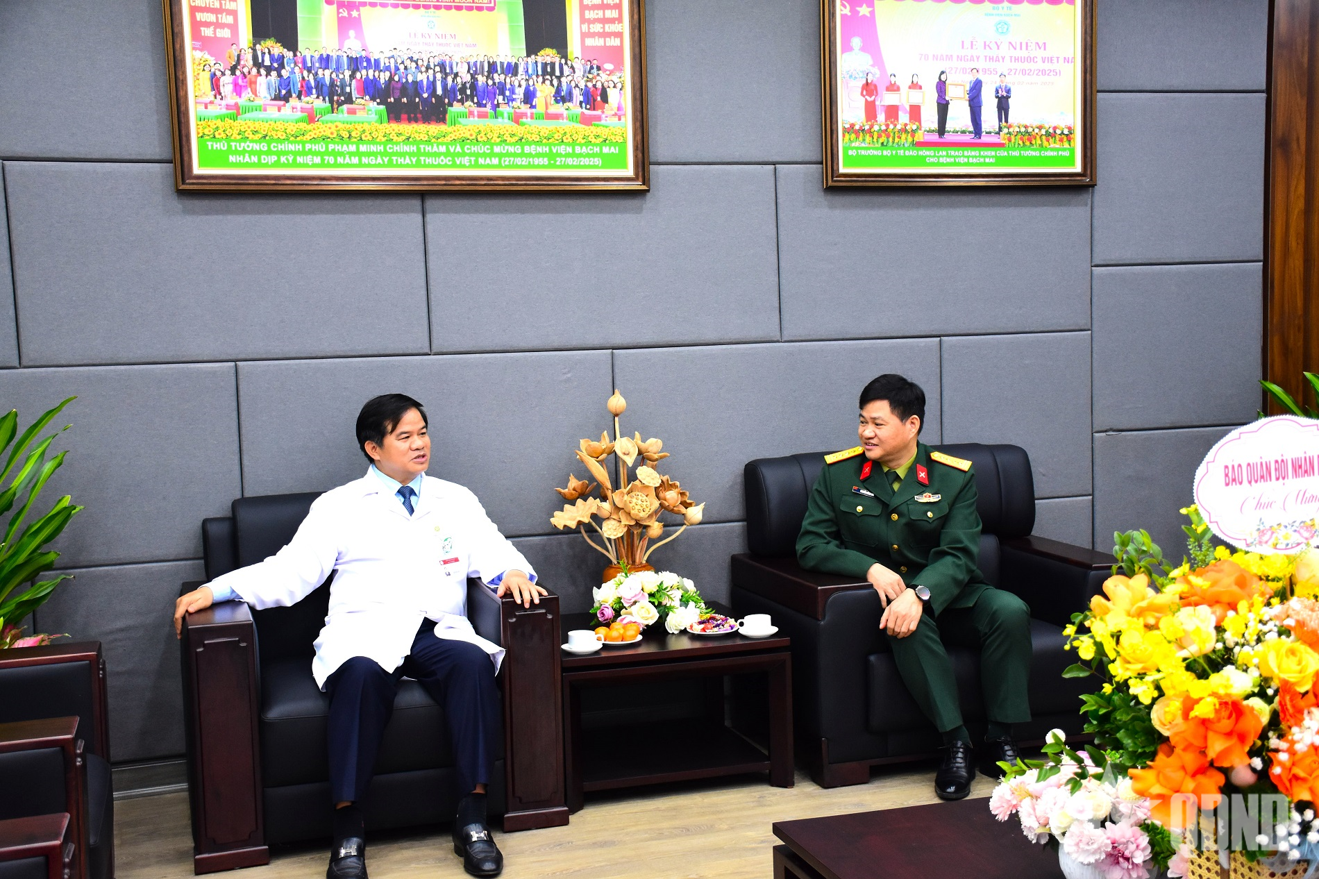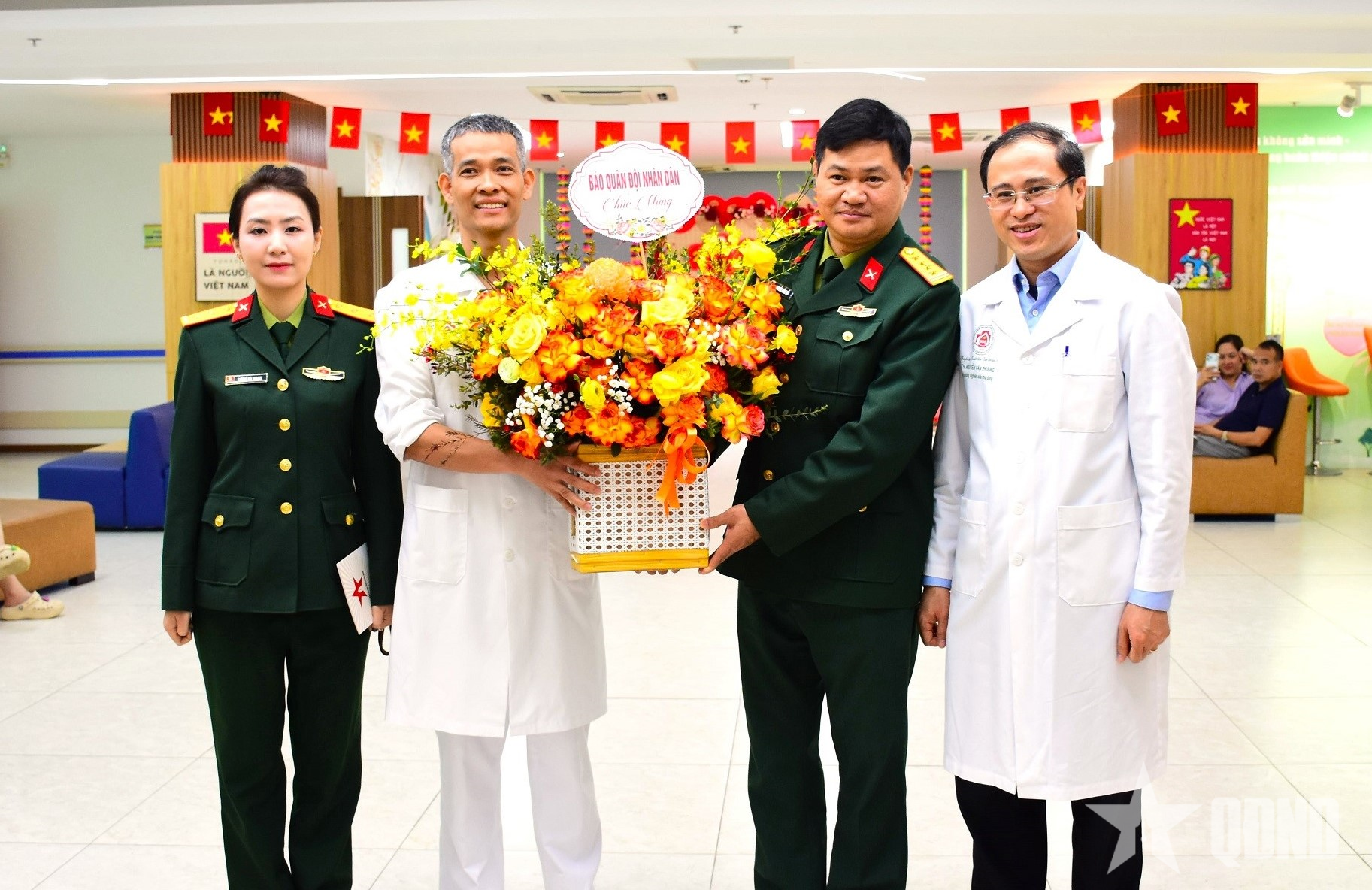 Đại tá Nguyễn Hồng Hải tặng hoa, gửi lời chúc mừng tới lãnh đạo Bệnh viện Bạch Mai.