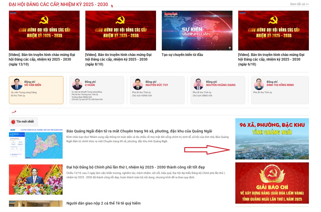 Giao diện Chuyên trang 96 xã, phường, đặc khu tỉnh Quảng Ngãi trên phiên bản PC.