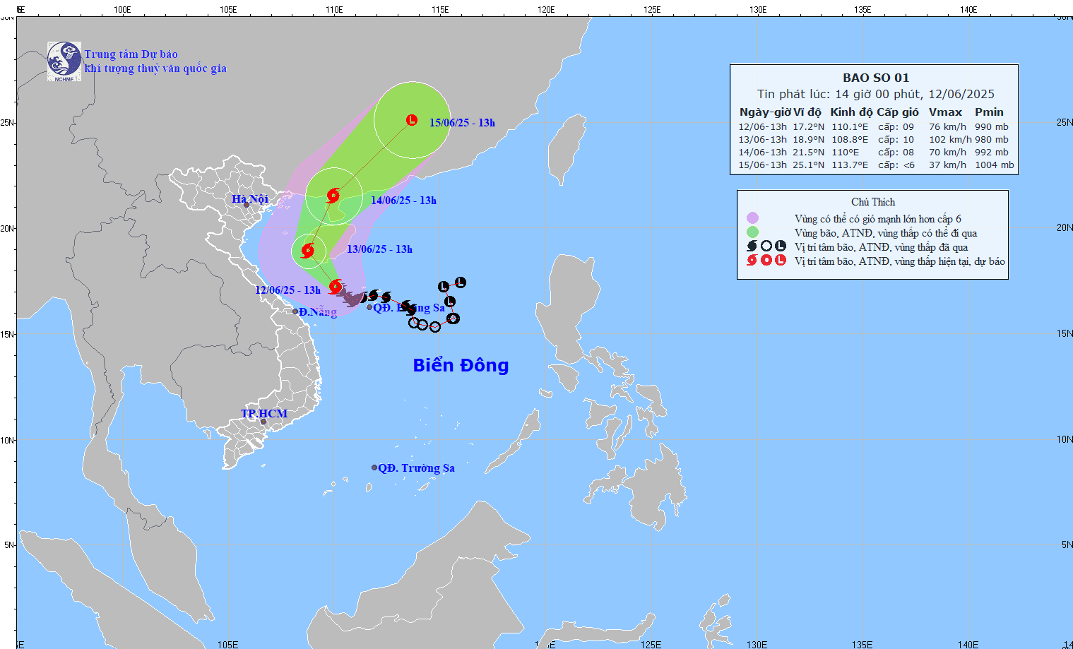 Hướng di chuyển của bão số 1 cập nhật chiều 12/6. Nguồn: NCHMF