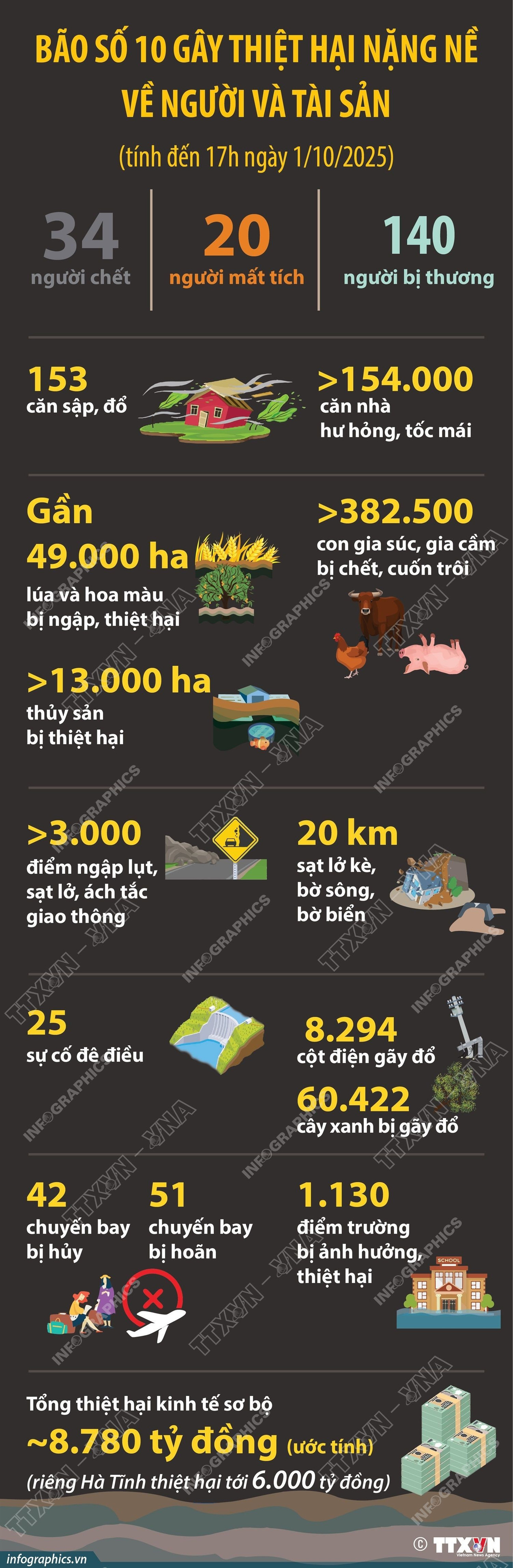 Theo báo cáo nhanh Cục Đê điều và Phòng chống thiên tai (Bộ Nông nghiệp và Môi trường), tính đến 17 giờ ngày 1/10, bão số 10 kèm mưa lớn, sạt lở, giông lốc đã gây hậu quả nghiêm trọng tại nhiều tỉnh, thành phố từ miền núi phía bắc đến miền trung, làm 194 người thương vong và mất tích, gây thiệt hại ước khoảng 8.780 tỷ đồng./.