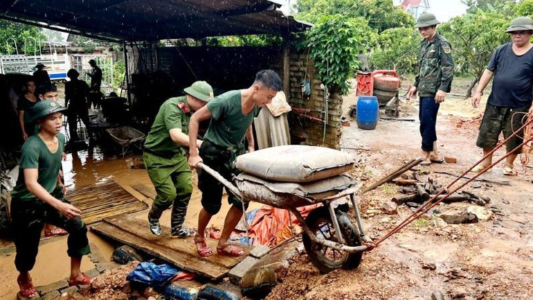 Cán bộ, chiến sĩ Trung đoàn 101, Sư đoàn 325 (Quân đoàn 12) cùng Công an xã Nam Dương khẩn trương giúp người dân trên địa bàn di chuyển tài sản đến nơi an toàn.